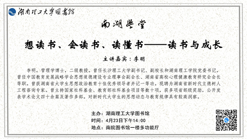 您当前的位置:首页 > 活动 > 活动预告 活动预告 活动预告 往期回顾 活动名称: 南 湖 学 堂 主讲人:李 明 时 间:2026-04-23 14:00:00 地 点:图书馆一楼多功能厅 < 返回