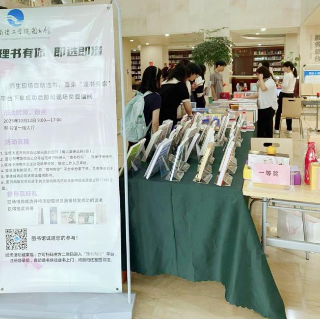2025年10月12日上午,湖南理工学院图书馆大厅内热闹非凡、人头攒动。正值新生入馆教育的重要时期,图书馆资源建设部老师抓住这一关键节点,精心策划并开展了一场主题为“理书有你 即选即借”的线下推广活动,旨在通过“理书有你”线上借购平台,进一步丰富新生读者的阅读体验。