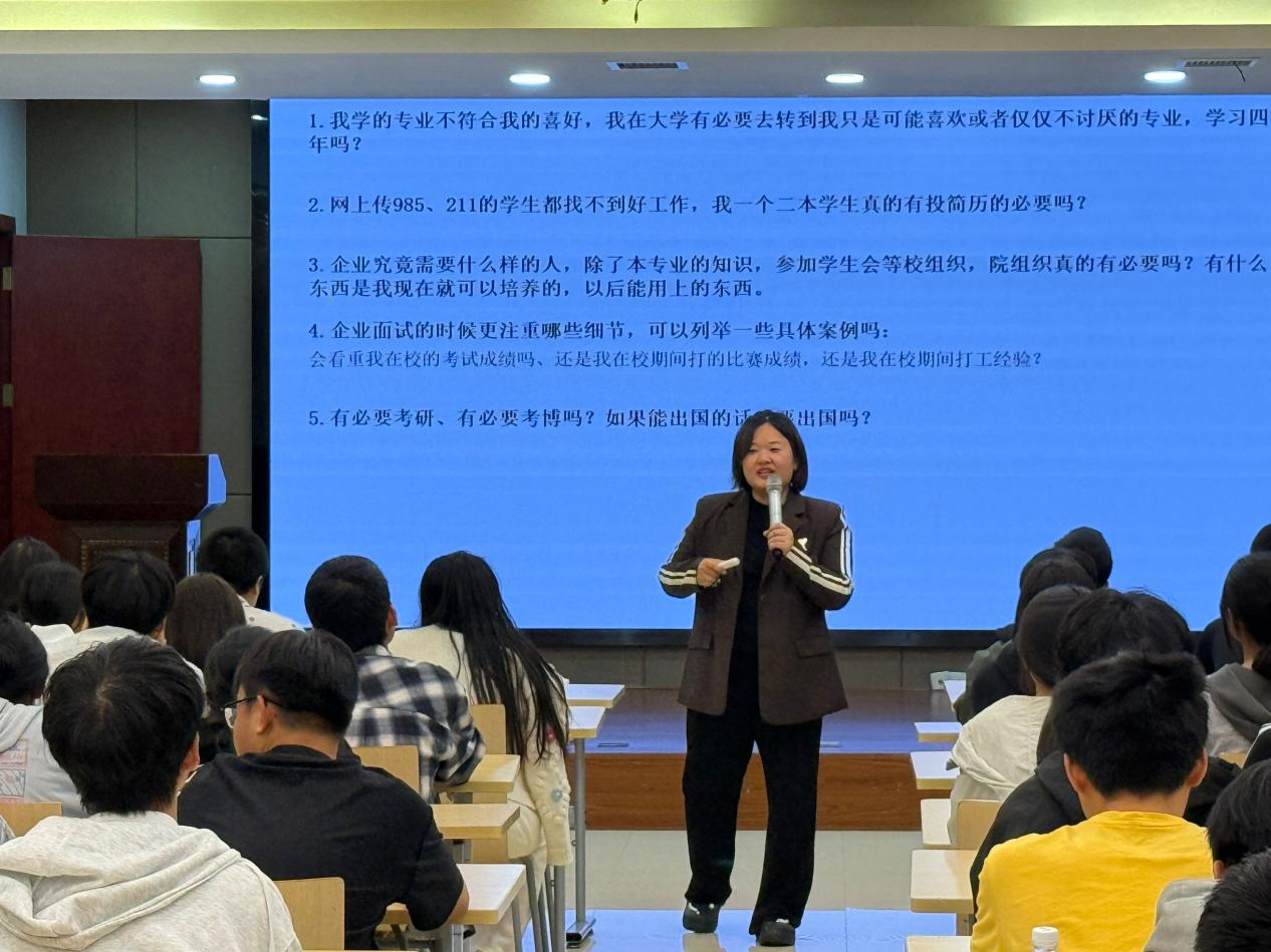 在自由问答的专场中,从“专业与职业的适配度”到“实习选择的优先级”,同学们带着困惑与导师面对面交流,个性化的规划建议让在场学子频频点头。