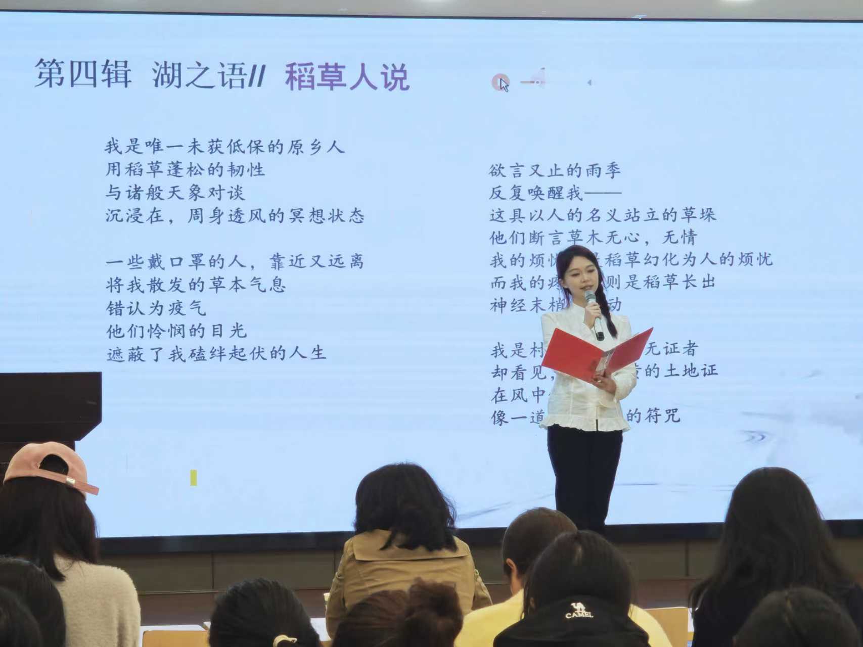 活动现场邀请了四位同学朗读《传说中的一只水童》《白鲟标本》等诗歌:“传说中的一只水童,曳着月色向我游来”,以灵动意象勾勒湖的灵韵;“给最后一条白鲟标本刷上桐油”,则藏着对生态的温柔关切。刘创说到诗歌要注重细节描述,将创作时的思考娓娓道来,每一首诗都以不同的角度展现出“大湖的心跳”,让同学们从诗意的角度窥见自然与生命的共生之美。