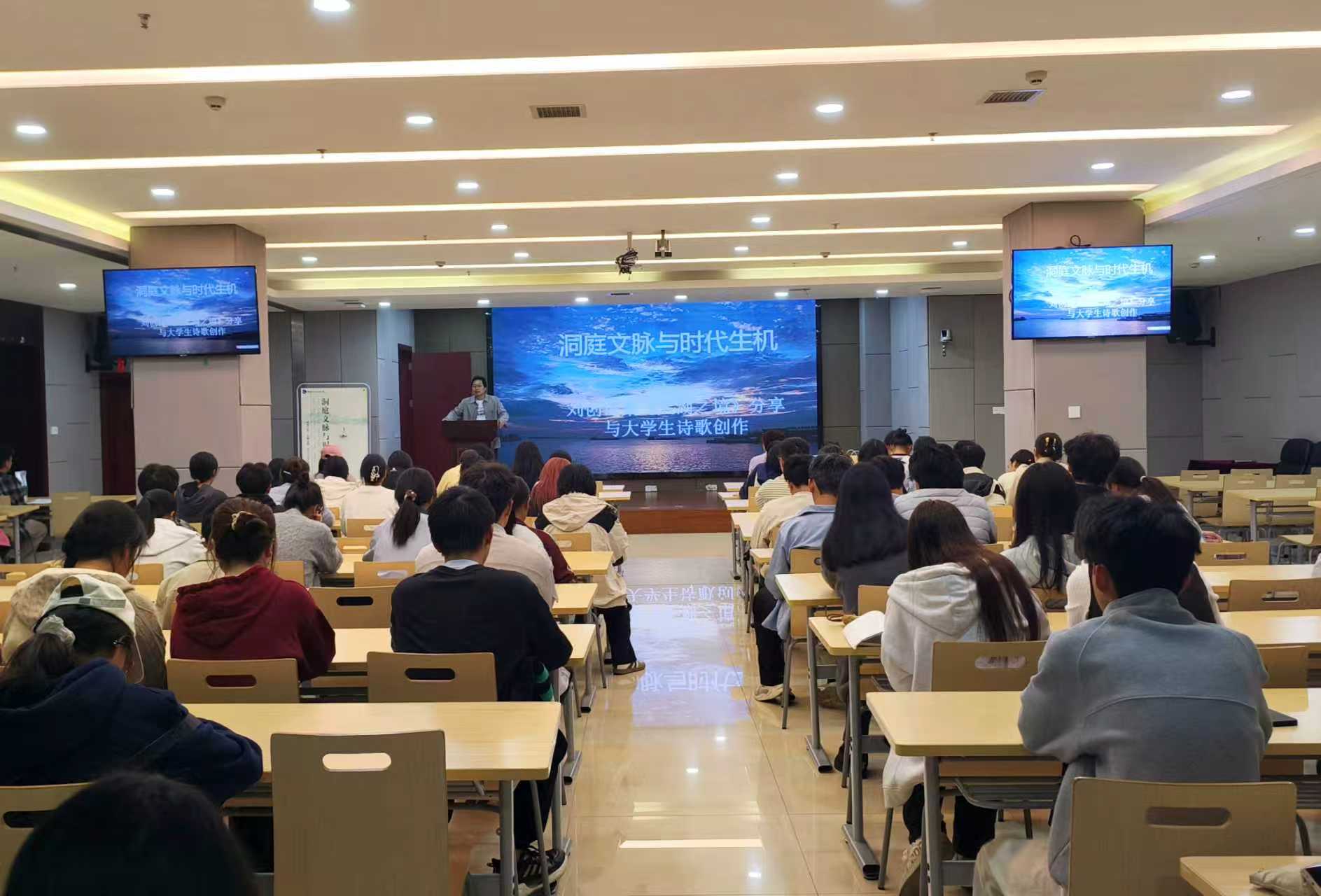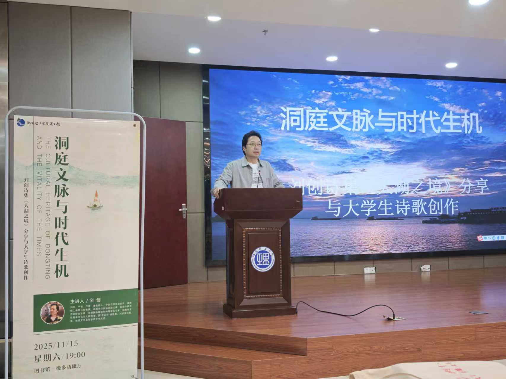 当千年墨香邂逅青春创作,一场诗与湖的对话徐徐拉开序幕。11月15日晚,一场主题为“洞庭文脉与时代生机”的刘创《大湖之境》诗歌分享会活动,在湖南理工学院图书馆一楼多功能厅温暖开场,现场100余名热爱诗歌的师生读者共赴一场洞庭湖畔的文学之约。