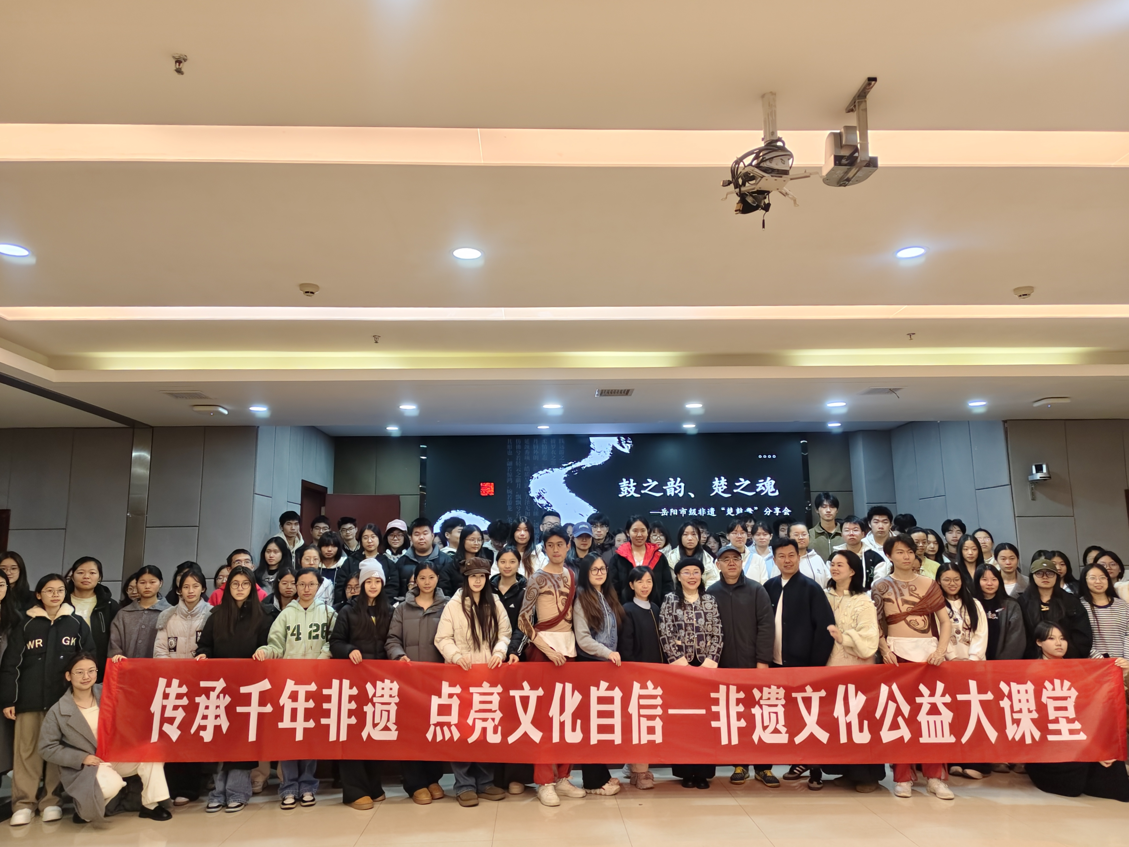 11月21日晚,一场主题为“鼓之韵 楚之魂”的岳阳市级非遗项目“楚鼓舞”展演分享会在湖南理工学院图书馆一楼多功能厅内精彩上演。“楚鼓舞”传承人、岳阳市原文联副主席戴宝萍老师受邀前来,与现场100余名师生读者一起感受非遗文化的魅力。本活动由湖南理工学院图书馆和岳阳市岳阳楼区文化馆联合举办。