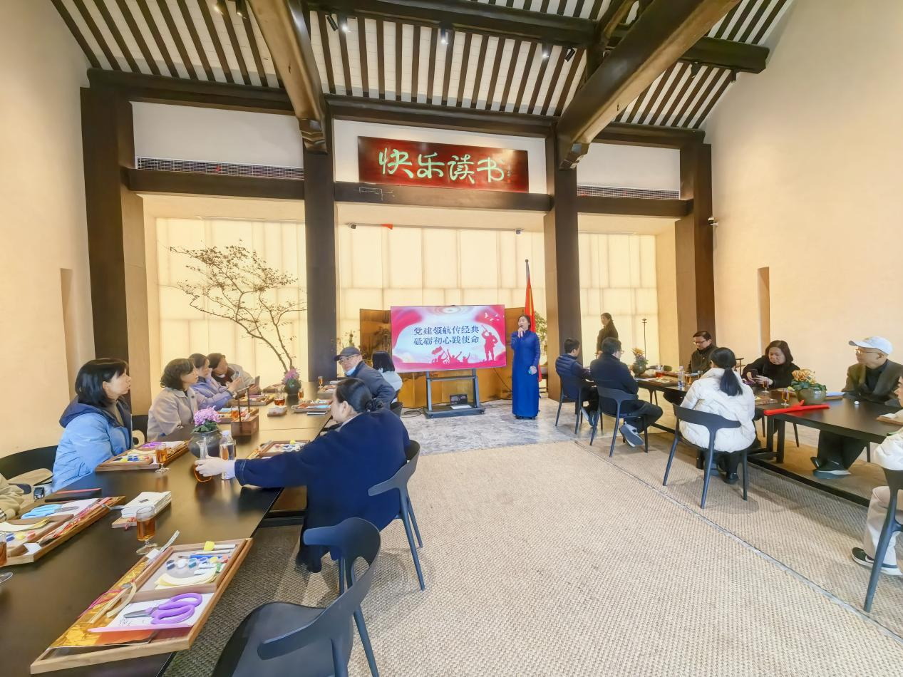 12月3日下午,金鹗书院古朴的庭院中传来阵阵欢声笑语,机关三总支第21党支部的十八名党员围坐一堂,指尖翻飞间,青翠的竹篾化作灵动的书签,这场以“党建领航传经典・砥砺初心践使命”为主题的党日活动正在此举行。