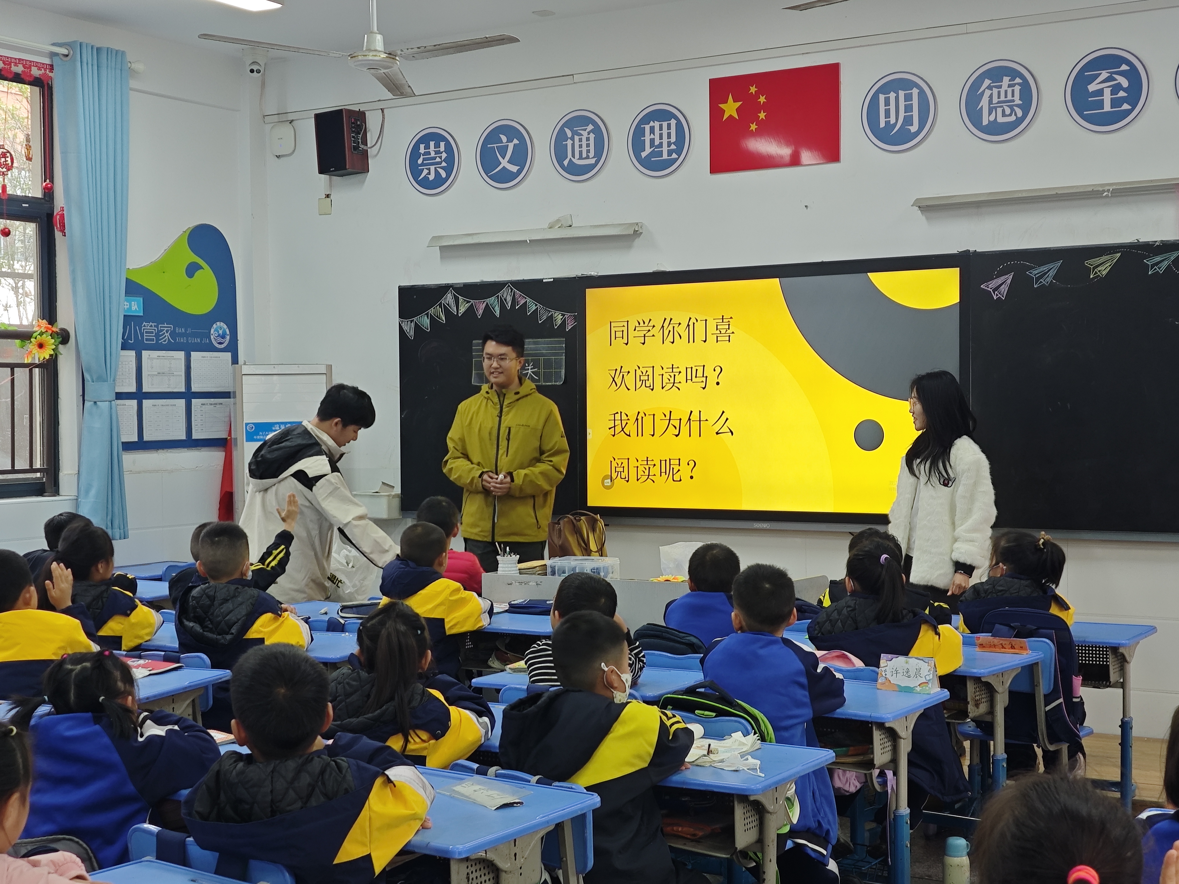 分级阅读分享,经典故事各有精彩。针对一年级学生,志愿者以《曹冲称象》为主题,用童趣十足的语言讲述故事,配合生动的手势和表情,将曹冲的聪慧形象刻画得栩栩如生。讲解中穿插“曹冲为什么能想到好办法”“你还有其他称象妙招吗”等互动提问,孩子们踊跃举手,思维火花四溅。六年级课堂上,《格列佛游记》的分享则充满奇幻色彩。志愿者先介绍作者斯威夫特及作品创作背景,再选取小人国、大人国的经典片段展开讲述,引导大家思考故事背后的社会寓意。通过图文结合的方式梳理人物关系与情节脉络,让原本略显深奥的名著变得通俗易懂,小朋友们听得津津有味,不时发出阵阵惊叹。