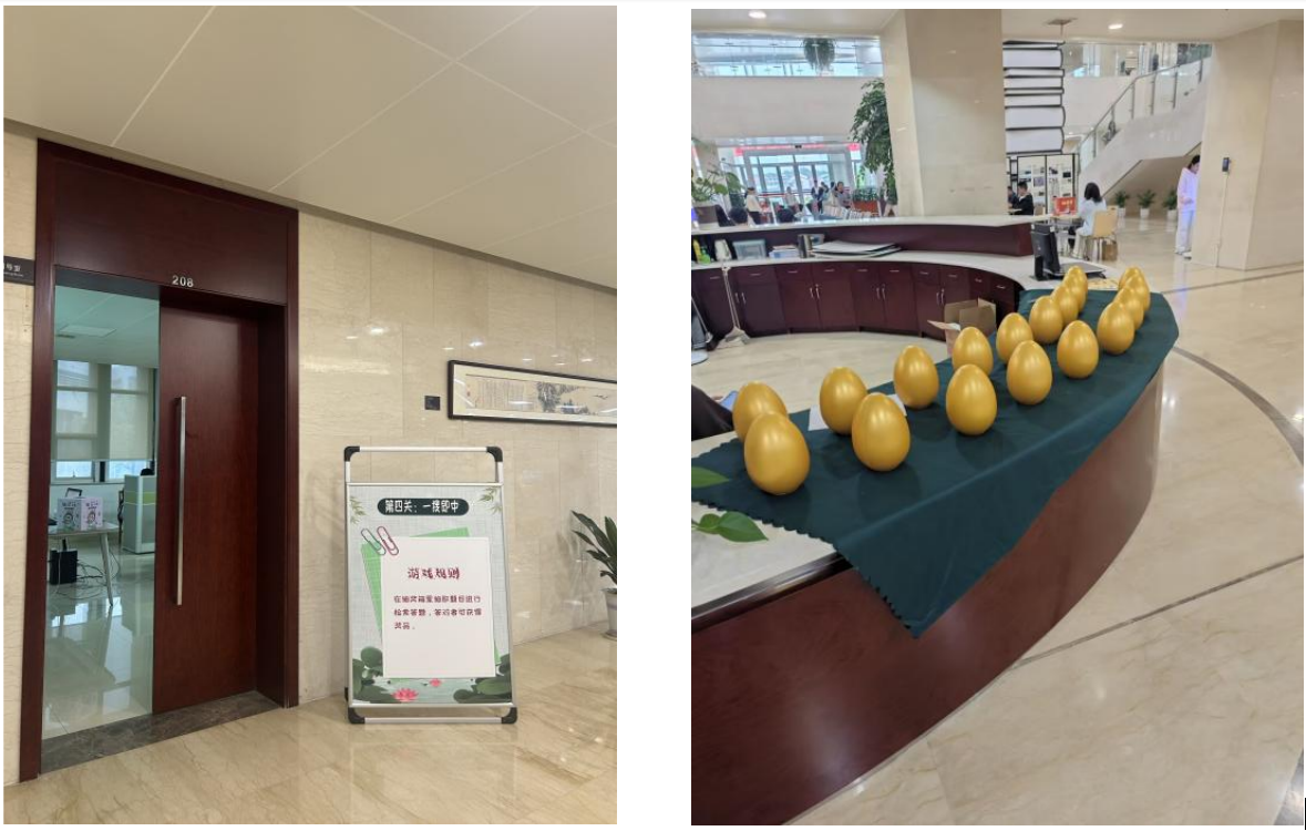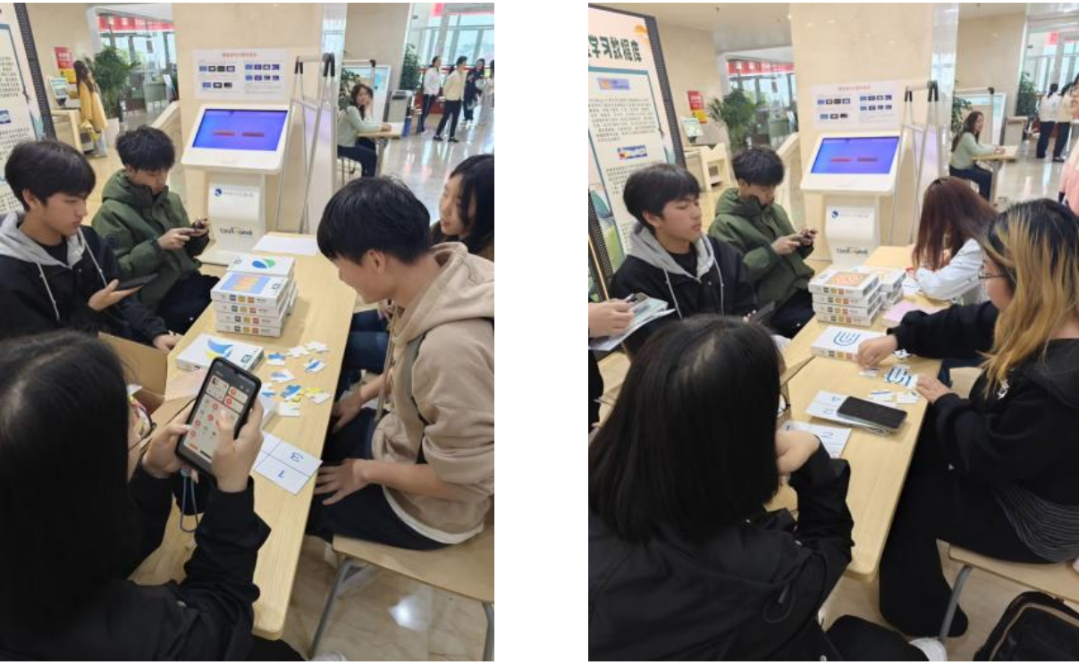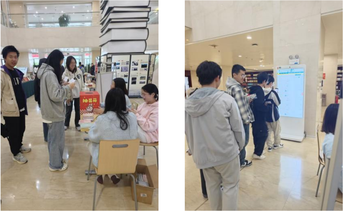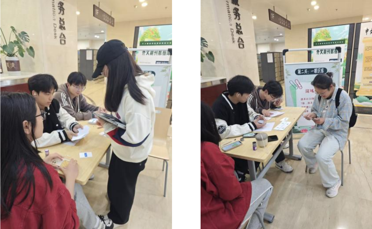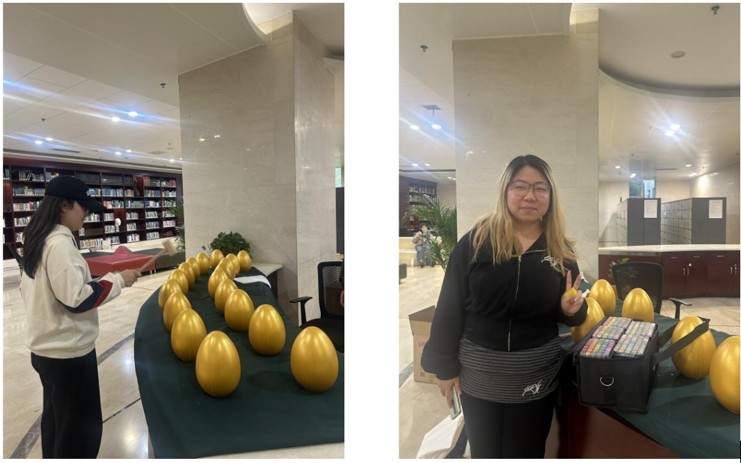 下午三点,游园会在图书馆一楼大厅正式拉开帷幕。每位参与者在入口处领取一张专属通关卡片,依次挑战“一拼即合”“一眼识库”“一书不落”“一搜即中”四道关卡。每通过一关,关卡负责人便会在卡片上盖上特色印章,集齐全部印章的读者可参与砸金蛋获取神秘奖品。